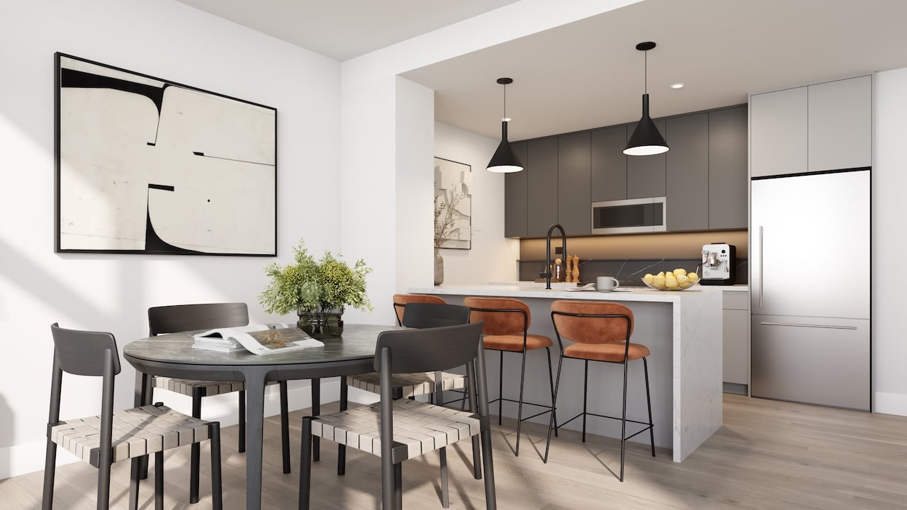 The residences at Johnston Reserve offer a blend of modern design and elegant finishes. Each apartment is equipped with White Oak wood-style flooring that sets a cool, bright tone throughout. The kitchens feature custom two-tone cabinetry and premium natural Quartz countertops, paired with a Soapstone backsplash for a striking visual appeal. Mid-century modern pendant lighting enhances the contemporary atmosphere, while Frigidaire stainless steel appliances, including a refrigerator, electric range, over-the-range microwave, and dishwasher, provide wonderful functionality. Matte black faucets and fixtures further elevate the interior design.